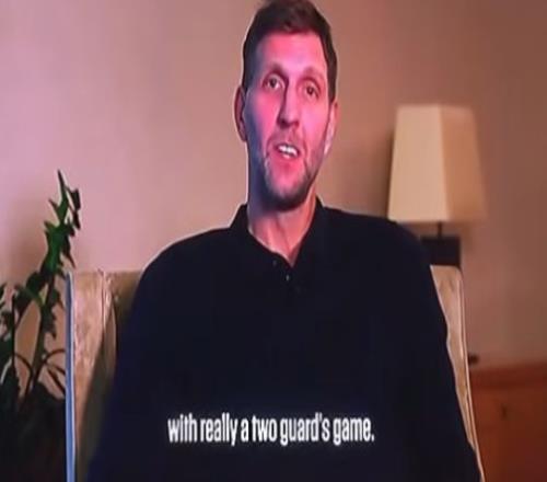 今天他打2号位——赛后德克发祝贺视频,第一句话,“他就是个七尺长人,2号位技艺”——超过了德克。